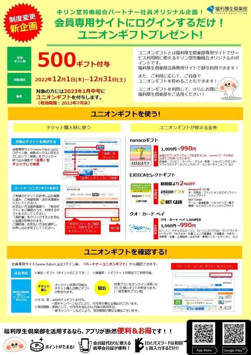 ユニオンギフトとは福利厚生倶楽部専用サイトでサービス利用時に使えるキリン堂労働組合オリジナルのポイントです