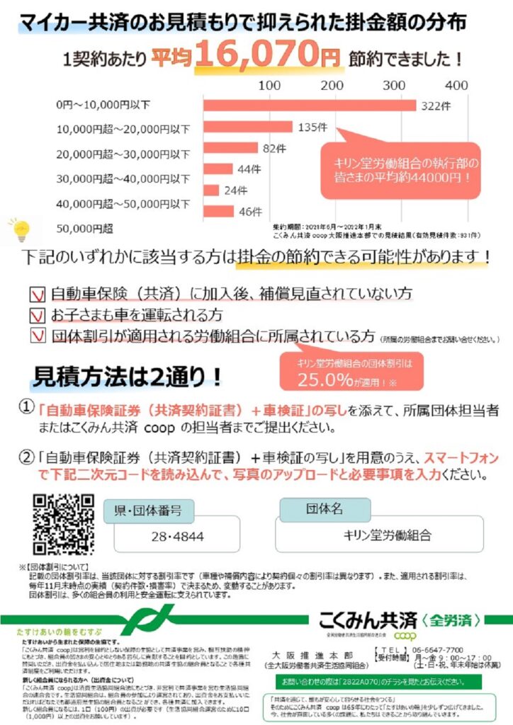キリン堂執行部で6件見積もりを取り、平均で約44,000円掛金節約につながっています
